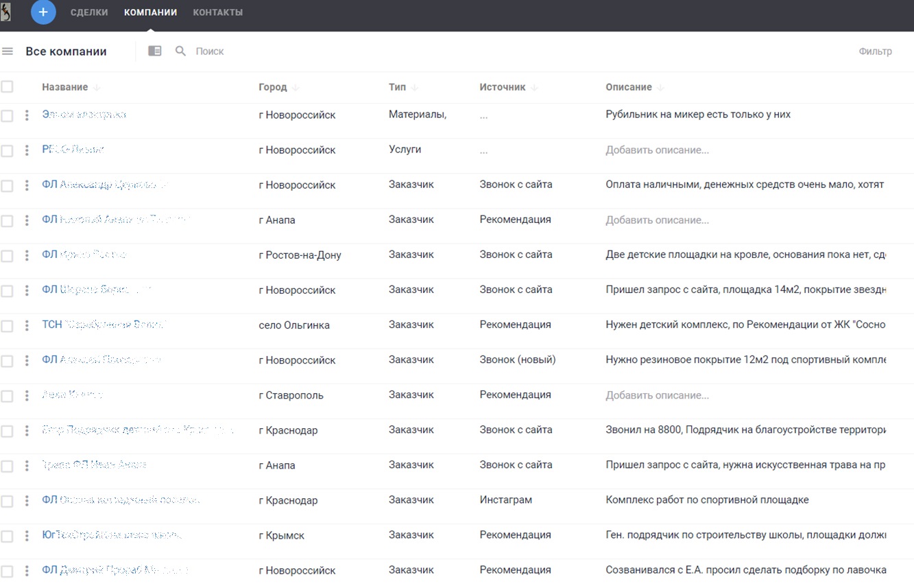 Мы не вели ее ни в Excel, ни в Word, поэтому вручную внесли данные всех заказчиков из личных блокнотов сотрудников. Удобно, что эта информация есть не только в карточке клиента, но и в общей таблице. Это помогает нам отслеживать, откуда поступает больше всего заявок: с сайта, соцсетей, по рекомендации. Источник указывает менеджер в карточке клиента, когда обрабатывает заявку.