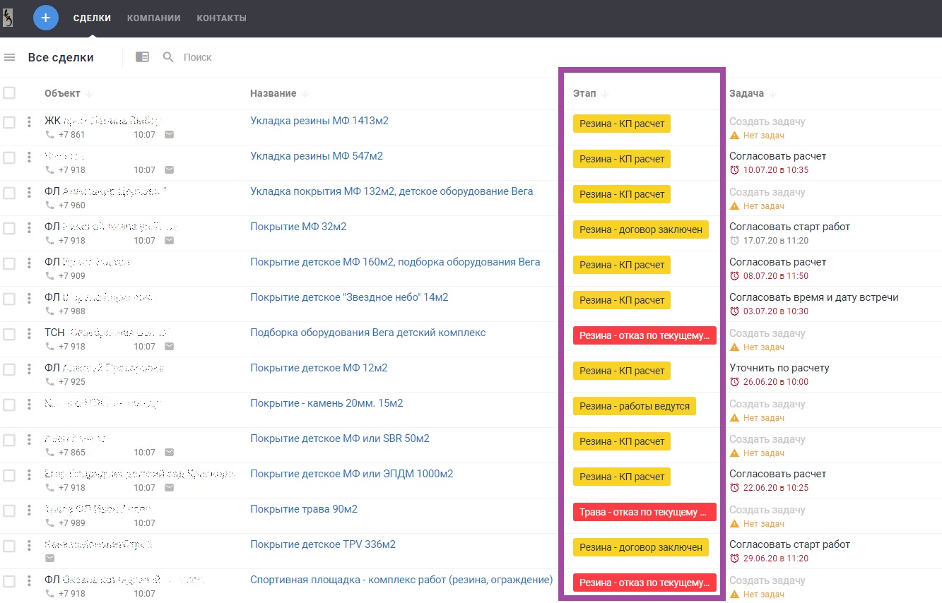 Когда получаем ответ, то переводим заказчика на этап «Отказ» или «Договор заключен». Когда сотрудники выезжают на объект, начинают расчищать площадку или подвозить материалы, переводим сделку на этап «Работы ведутся».