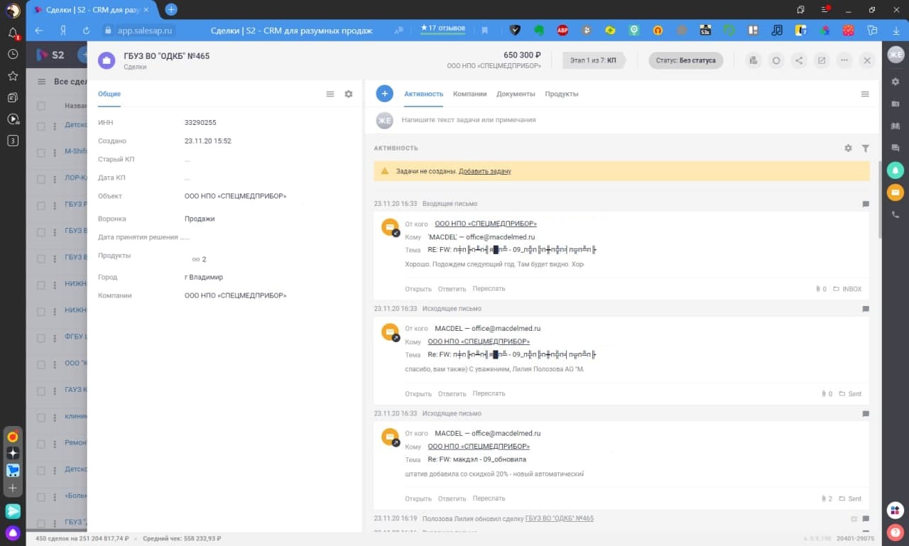 Карточка сделки в воронке продаж МАКДЭЛ-Технологии.