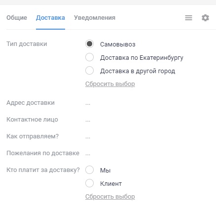 Во второй указываем условия доставки. Раньше приходилось искать в договоре, как клиент хочет получить заказ: самовывозом или через доставку. Теперь эта информация есть в карточке заявки: