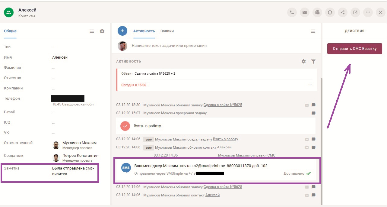 Подключили интеграцию с сервисом SMS-рассылок. Также мы отправляем из CRM SMS-визитку после первого звонка заказчику. Это нужно для того, чтобы клиент случайно не потерял наши контакты. Мы делаем это вручную, так как не все клиенты соглашаются получать SMS.