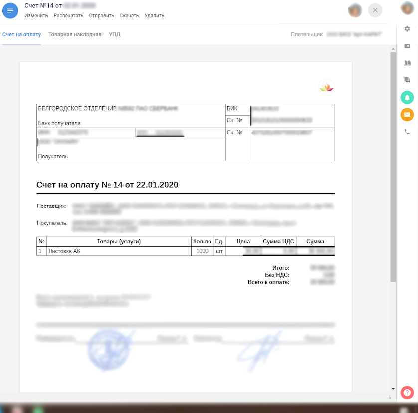 Теперь прямо в карточке сделки мы открываем шаблон счета, в него автоматически подтягиваются нужные данные, и в один клик отправляем готовый документ клиенту на email. Занимает действие не больше минуты.