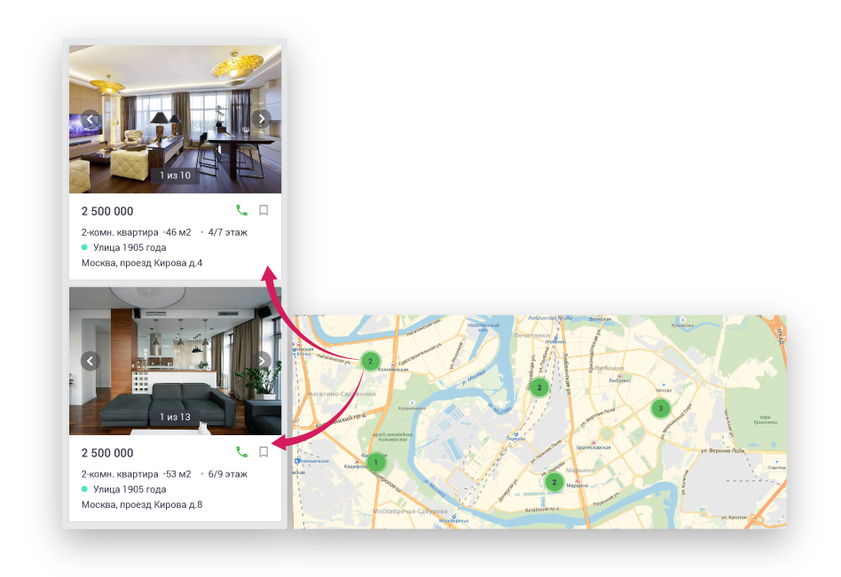 Объекты в базе недвижимости CRM можно просматривать в формате каталога, таблицы или на карте, фильтровать по любым полям. А чтобы подобрать варианты по заявке клиента, достаточно указать параметры, и программа автоматически найдет подходящие объекты.
